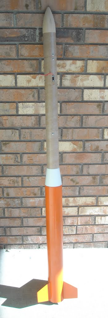 The boost on the H123 motor went well and apogee is estimated to be 1500 feet. There was no excessive tilt due to the trailing antenna wire. The ejection charge went off near apogee and the four foot diameter chute deployed. At that point something began free falling. As the items left under the chute were being pushed by the wind I had to keep my weak eyes on that part. The chute part landed three minutes after pushing the button to launch. So I thought there was a three minute hang time for the beacon but that was not the case because the recovered part under the chute was the booster and not the beacon payload. After getting back to the flight line the beacon was still transmitting on the ground. At that point I found my rotatable dipole could null out on the signal and give a line on the beacons direction. I took the SST-20 and started walking around with just a little wire as an antenna. So it was helping the location effort but someone found the beacon payload before I did. The payload was intact and undamaged. There was no damage to the trailing wire. The forces at apogee ejection caused the payload to separate. The payload was connected with a cardboard tube that had two screws instead of a glue joint and the cardboard screws tore from the screws.