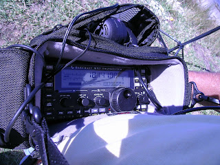 Today, I used the Elecraft KX3 for pedestrian mobile. The outfitting included the KX3 in a LowePro bag with the lid cut off. I used the belt loops of the bag plus the strap over my shoulder. On my back was an alice pack frame. The frame had a 10 Ah LiFePO4 battery tied to it which is very light. The frame also had a lap desk plastic sheet with the pillow removed strapped to it. Which in turn had a 13 foot crappie pole strapped to it.
