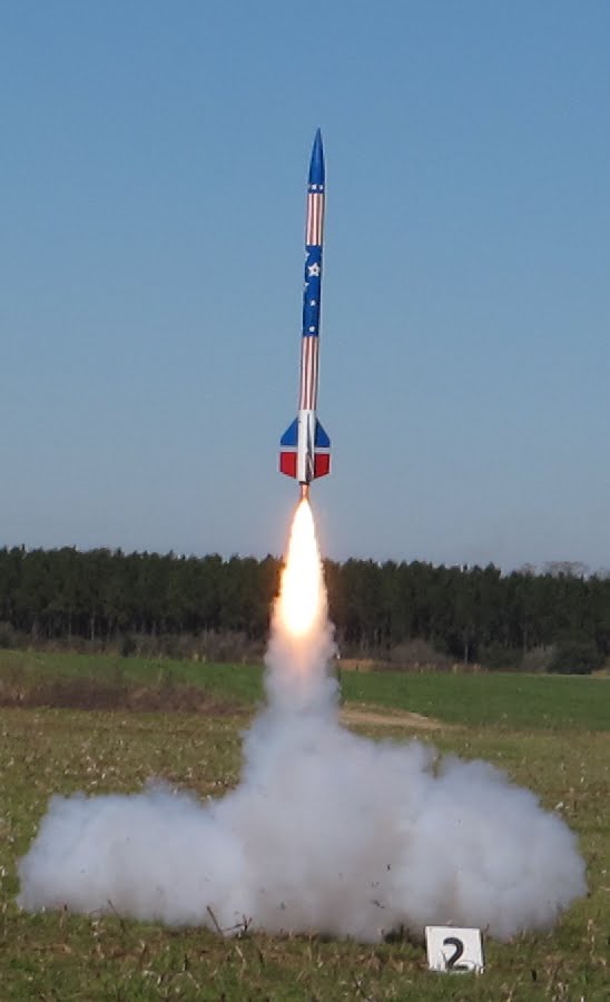 My QRZ.com N4KGL page has my Mighty Mo rocket photo above. It was the featured profile for a while on QRZ.com. John W8JER of Sturgis, Michigan saw the photo and just had to check our rockets. At the February 2nd Samson AL launch John drove up and parked. I am always encouraging folks to come to our rocket launches. However, we don't usually draw folks from Michigan. John and his wife Michelle made Samson a stop on their way to the Orlando Hamcation. So John and Michelle had plenty of rockets to watch. I launched my 4 inch diameter Thor with a patriotic paint scheme on a 54 mm J415 motor..