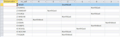The delta of the average SNR for simultaneous spots is shown above for N4KGL - W4RYZ. The numbers on the header are the deltas in decibels. Eight out of the twelve values are within two dB. Below are the values for the distance bins in kilometers. I will use a view like the one above to gauge the difference in average SNR when I locate one beacon at the salt water shore and one inland in a future test.